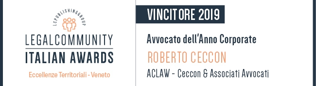 Durante l’edizione 2019 dei Legalcommunity Italian Awards, che si è svolta giovedì 11 luglio, al Salone delle Fontane a Roma, l'avvocato Roberto Ceccon – ACLAW – Ceccon & Associati Avvocati ha ricevuto il prestigioso premio AVVOCATO DELL’ANNO CORPORATE – VENETO.